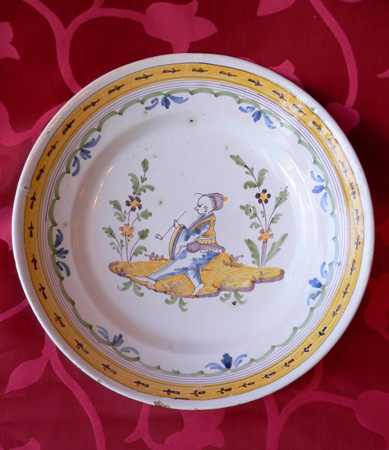 Eingetiefter Spiegel, breite Fahne mit glattem Rand, auf Standring. Im Spiegel eine Landschafts- Szene mit einer mit einer chinoisch inspirierten Figur mit einer Pfeife, eingerahmt von zwei Blütenzweigen. Auf der Fahne umlaufendes Bogenmuster mit acht stilisierten Behang Blättern. Am Rand umlaufend schmale Manganstreifen gefolgt von einem breitem gelben Streifen mit Streublättchen. Dekoriert in den Farben Gelb, Grün, Blau und Mangan.